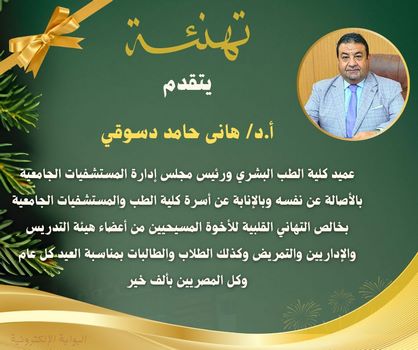 اسرة كلية الطب تقدم خالص التهانى والتبريكات لسيادة العميد ا. د/هانى حامد بمناسبة صدور قرار رئيس الجمهورية بتعيينه عميداً لكلية الطب البشرى . متمنيا لسيادته دوام التوفيق والسداد